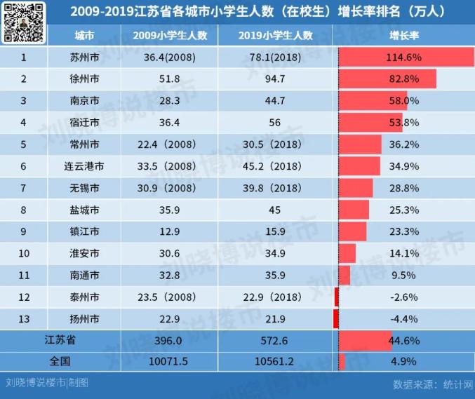 在江苏这样人口增长不错、经济发达的省份里,泰州和扬州竟然人口流失(小学生人数减少),这是非常令人意外的。