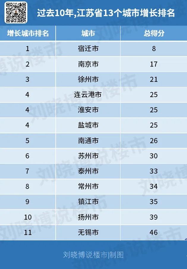 过去10年GDP的增长,宿迁、淮安、连云港等苏北城市垄断了前三,无锡、镇江、苏州、常州则位居后四位。