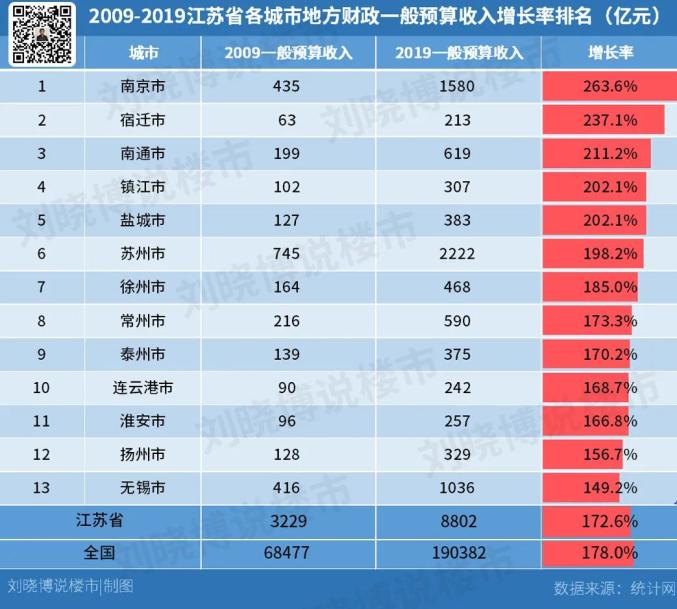 过去10年一般预算收入,南京、宿迁、南通位居前三。而无锡、扬州增长最慢。
