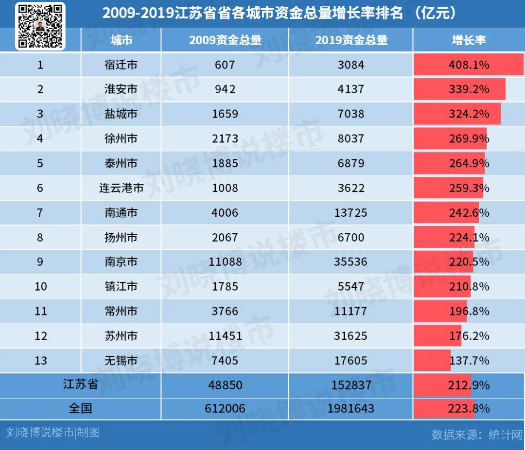 上图是过去10年,江苏13个地市资金总量的增长情况,宿迁、泰州、盐城、徐州这四个苏北城市垄断了前四名,其中宿迁的增速甚至超过400%。