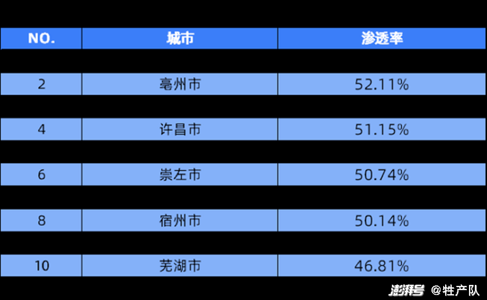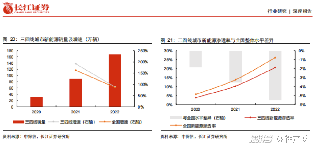 在三四线城市的新能源渗透率和全国平均渗透率相比,也差了5个百分点以上。
