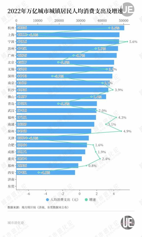 从各地统计部门已公布数据看,2022年,上海城镇居民人均可支配收入以84034元排名全国第一,重庆45509元居24城最末位;支出方面,杭州城镇居民人均消费支出反超上海跃居全国第一、达50336元,24城中人均消费支出最低的是西安,为27431元。