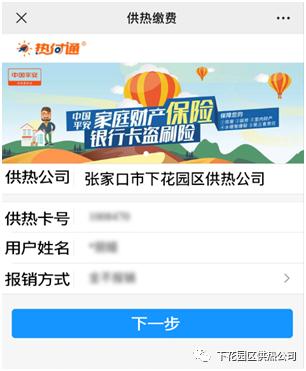 2、认真核对供暖卡号和用户姓名后,点击下一步
