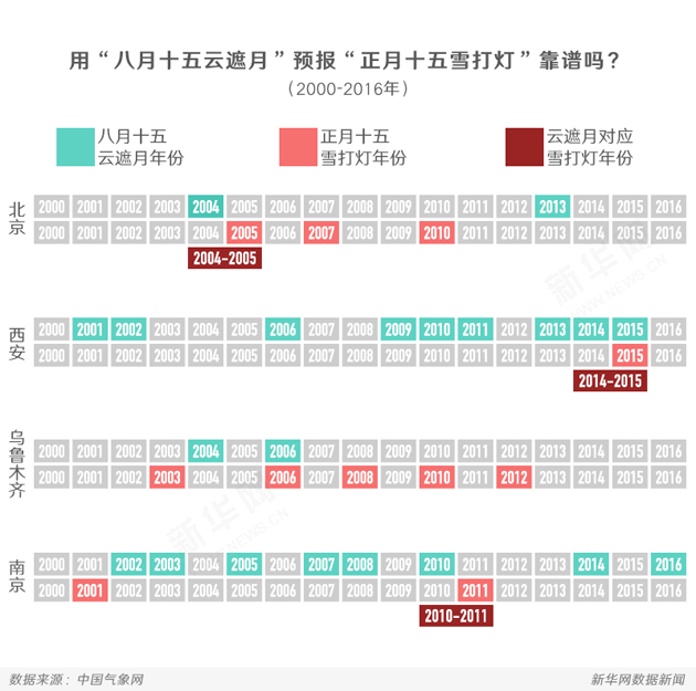 2000年至今,北京八月十五出现过2年云遮月的情况,元宵节雪打灯却出现过3次,但只有1次应了那句谚语;乌鲁木齐出现过2次云遮月的中秋节,雪打灯的元宵节却出现了5次,但这些年份并不存在对应关系;西安出现过9次云遮月的中秋节,却只出现过一次雪打灯的元宵节;南京亦是如此,8年云遮月,却也只换来2年雪打灯,1次对应关系。这样看来“八月十五云遮月,正月十五雪打灯”的说法似乎并不那么靠谱。