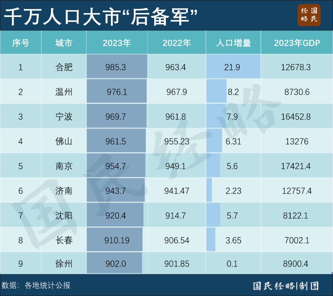 目前,在主要一二线城市里,合肥、宁波、南京、哈尔滨、济南、沈阳、长春都超过900万人,未来几年有望联袂晋级。