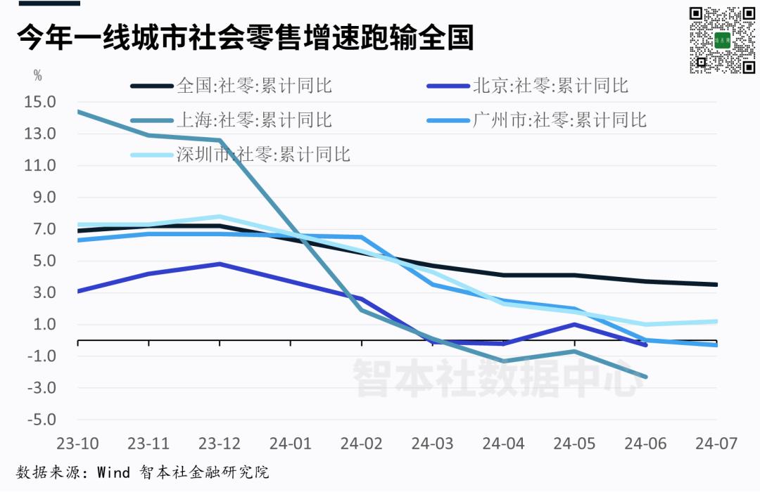 如果把城镇进一步细分,高线城市增速明显低于低线城市,其中一线城市消费出现下降。今年上半年,在一线城市的社会零售中,除了深圳上涨1%,广州持平,北京和上海分别下降0.3%和2.3%。6月份,北上广深分别下降6.3%、9.4%、9.3%和2.2%。