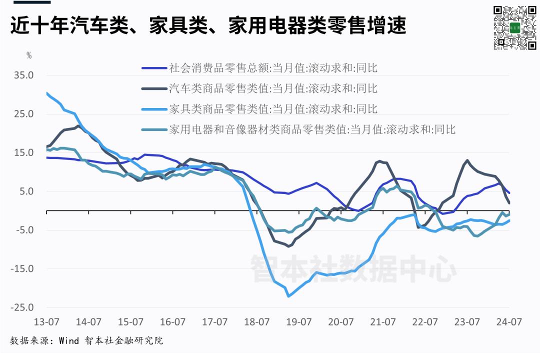 7月份,大类消费整体下降:汽车类下降4.9%,建筑及装潢材料类下降2.1%,家具类、家电类分别下跌1.1%、2.4%。除汽车以外的消费品零售额增长3.6%,高于整体零售额。这说明房地产全面下滑和汽车产能过剩拖累了消费市场。