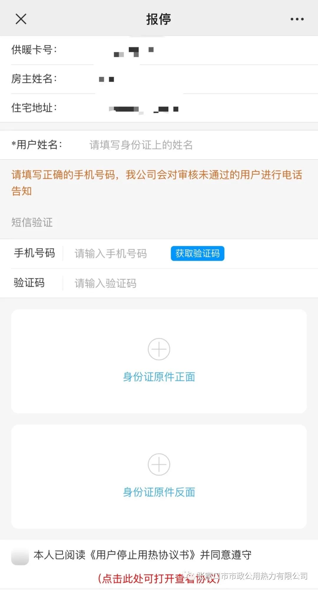 三、进入业务办理页面,确认信息,填写经办人姓名,手机号码(务必准确有效)及验证码、上传经办人身份证正、反面照片,点击“本人已阅读《用户停止用热协议书》并同意遵守”,提交。提交并不代表报停成功,报停资料审核时间为3个工作日,报停是否成功供热公司都将以微信形式通知用户结果。