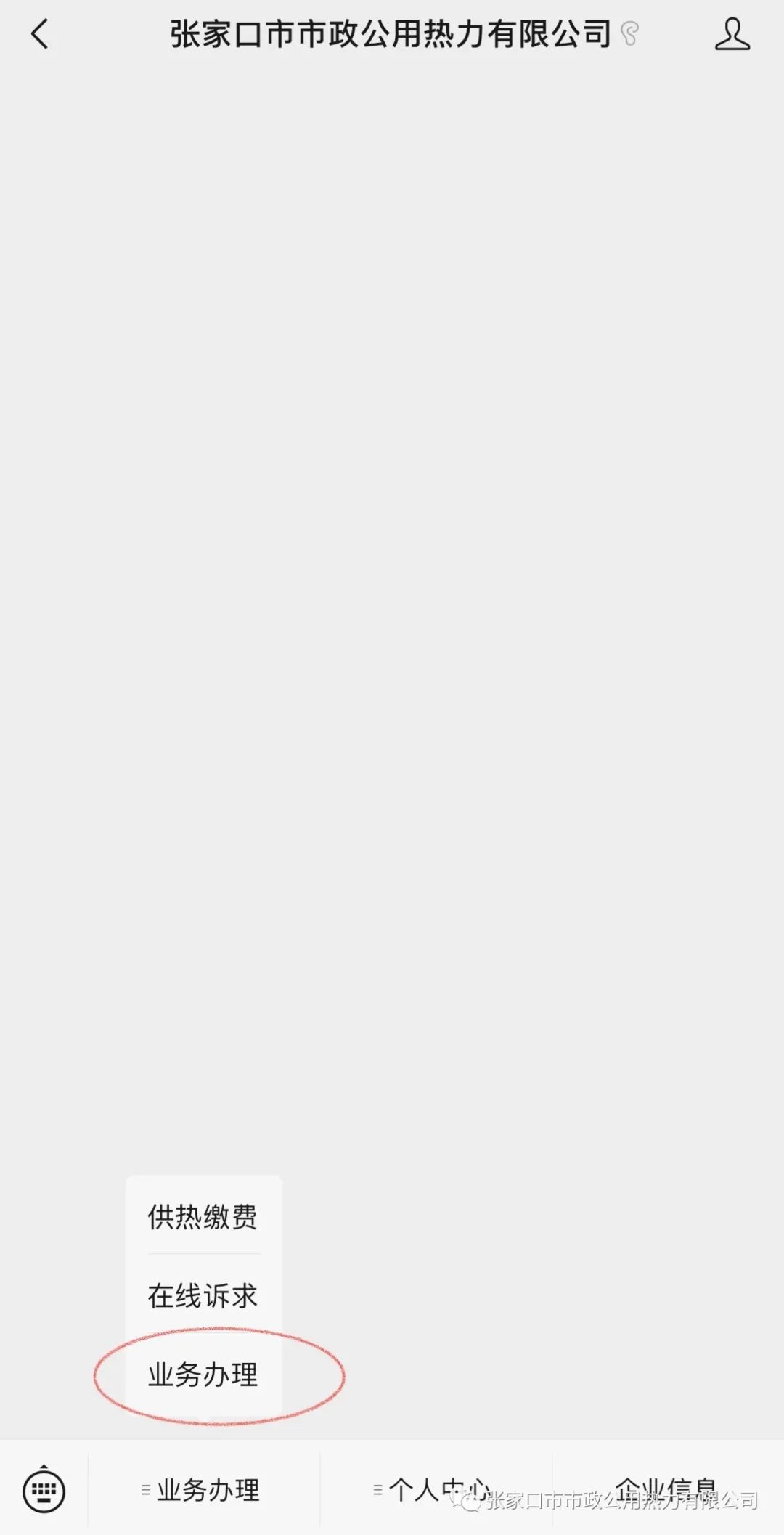 一、关注张家口市市政公用热力有限公司微信公众号,选择业务办理,选择供暖报停。