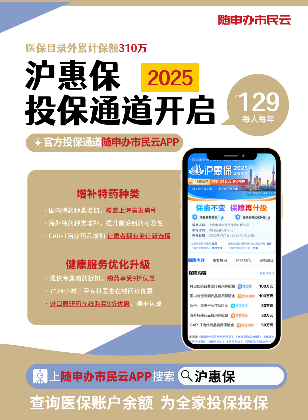 即日起至2025年6月30日,2025版“沪惠保”在官方参保通道“随申办市民云”APP开启投保,129元=310万元保障+全家安心!
