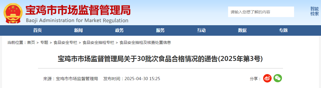 陕西省宝鸡市市场监督管理局关于30批次食品合格情况的通告(2025年第3号)
