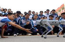 5月7日,在河南省济源市轵城镇校园科技节活动上,同学们与机器狗互动。当日,河南省济源市轵城镇举办以“智创未来,筑梦乡村”为主题的校园科技节活动,通过一系列科普项目展示,让学生们感受科技魅力。