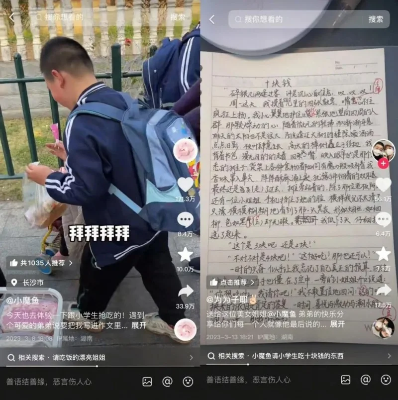本以为只是个小插曲,没想到,这条视频发出去之后,被男孩的姐姐刷到了,在评论区留言,说感谢她请她弟弟吃东西。几天后,男孩姐姐在自己账号上发了一条视频,贴出了男孩写的作文,标题叫《十块钱》,并@了申晗煜。