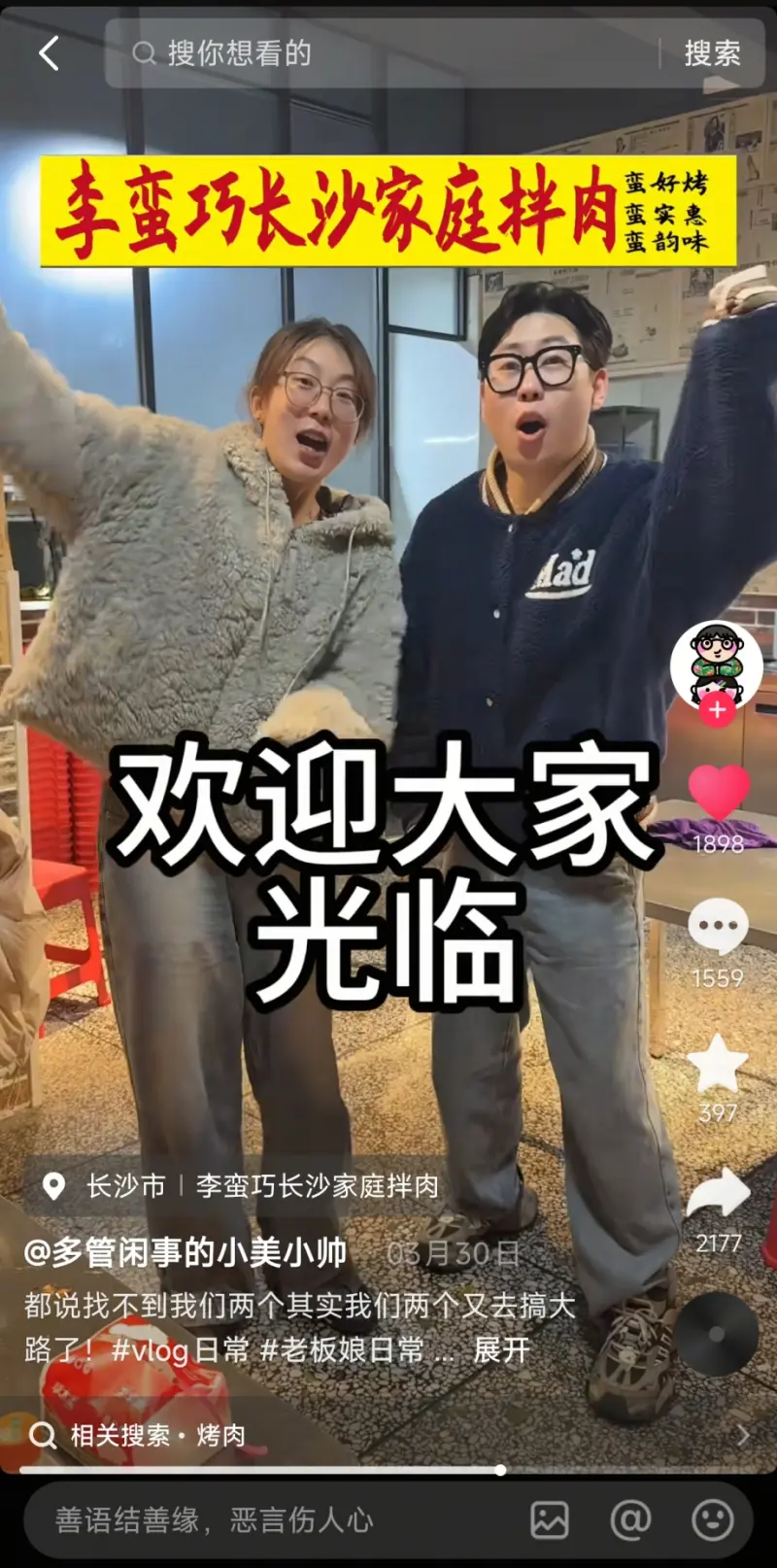 这样下去肯定不行,申晗煜决定结合自己的优势,用探店的方式宣传自己的小店。3月30日,小美和小帅在自己的抖音账号@多管闲事的小美小帅上发布了一条视频,告诉粉丝他们新开了一家店,在评论区抽10位朋友吃“霸王餐”。评论量很快到了1000,他们又追加了10个名额。