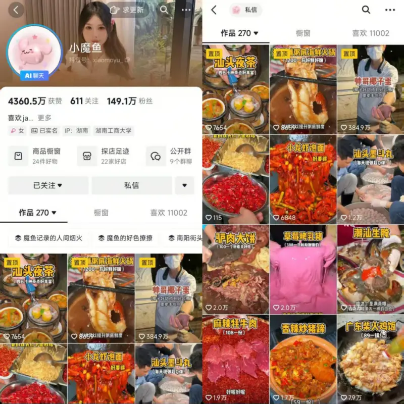 店主叫申晗煜,是个出生于1999年的河南姑娘。开店之前,她是美食探店达人@小魔鱼,2022年起,她跑遍了全国64个城市,品尝了三四百种美食,发布了268条作品,在抖音上积累了149万粉丝。