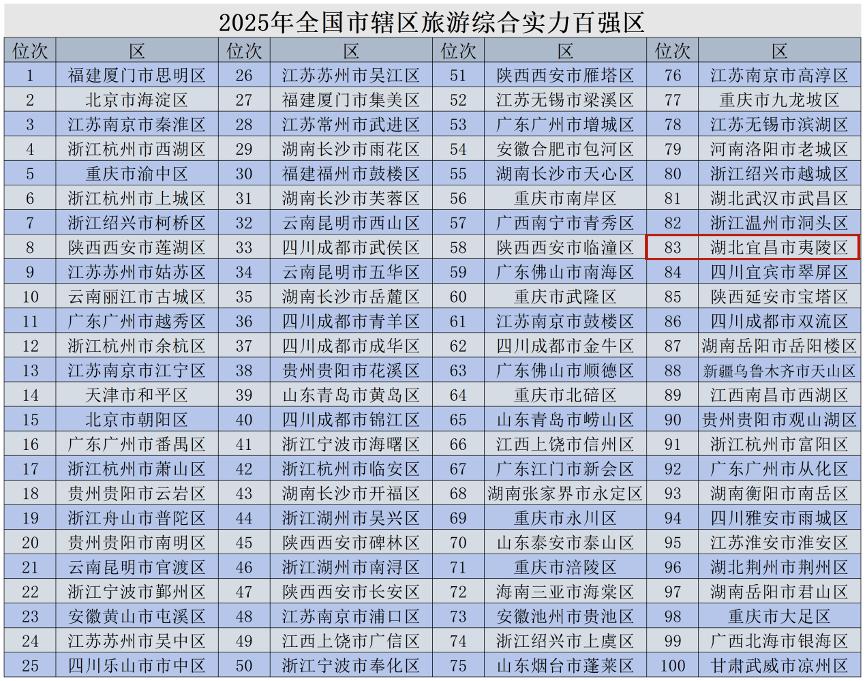 日前,《全国市辖区旅游研究报告2025》暨“2025年全国市辖区旅游综合实力百强区”“2025年全国市辖区旅游发展潜力百佳区”名单正式发布。