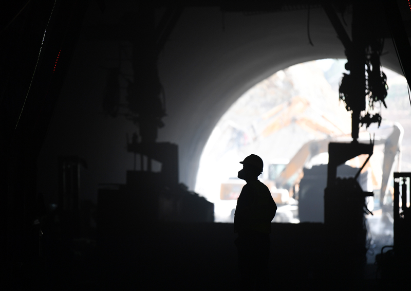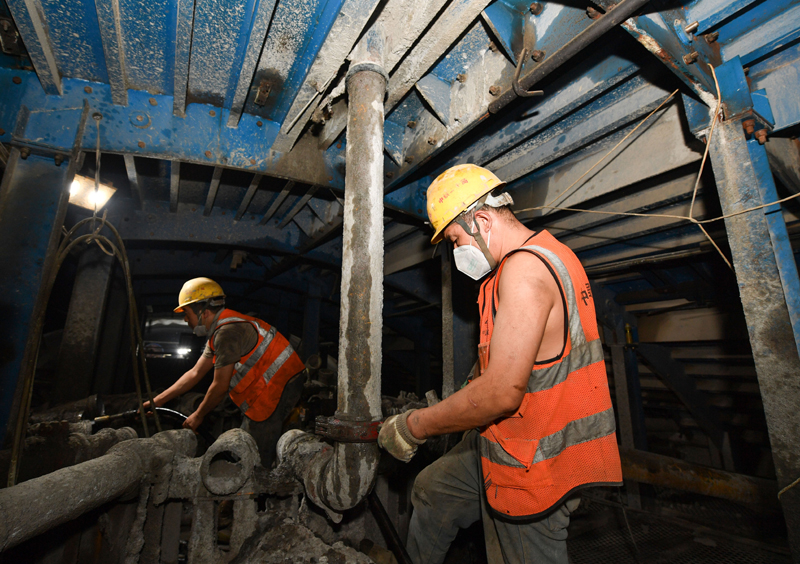 7月21日,中铁二十一局工人在位于陕西省延安市宝塔区的西延高铁柳燕隧道施工。