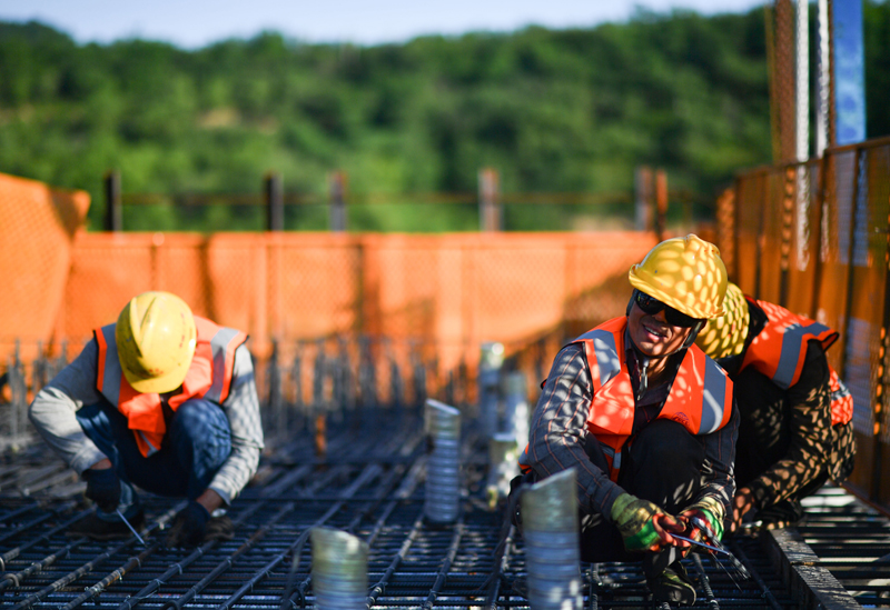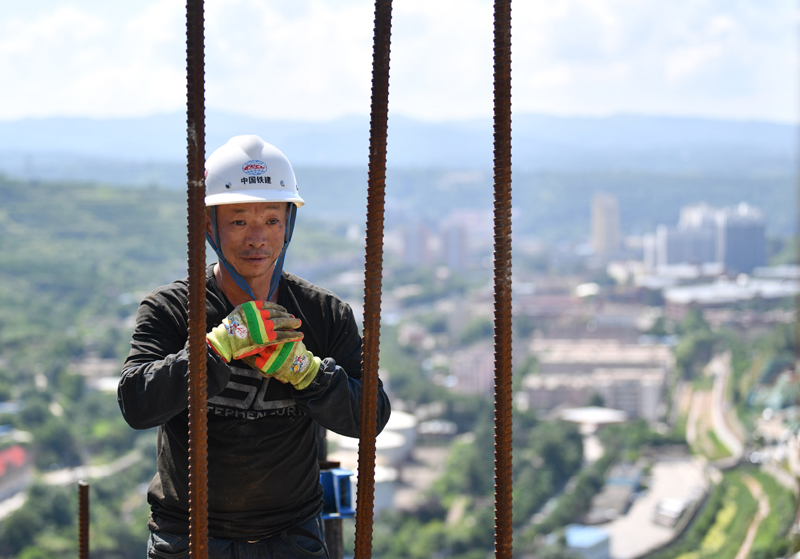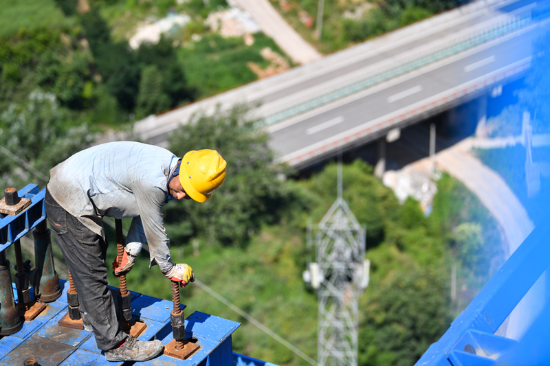 6月25日,中铁二十局工人在位于陕西省延安市洛川县的西延高铁北洛河特大桥施工。