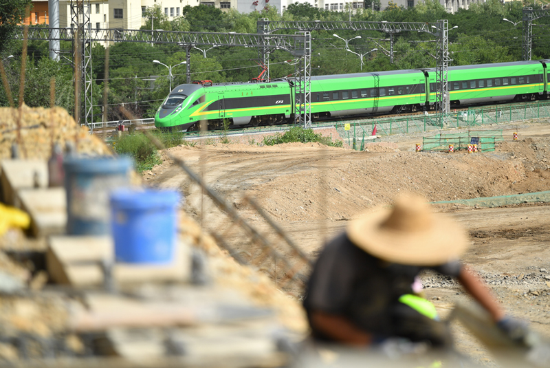 7月21日,中铁二十一局工人在位于陕西省延安市宝塔区的延安车站改造工程现场施工。在他的背后,一列动车组列车驶离延安站。
