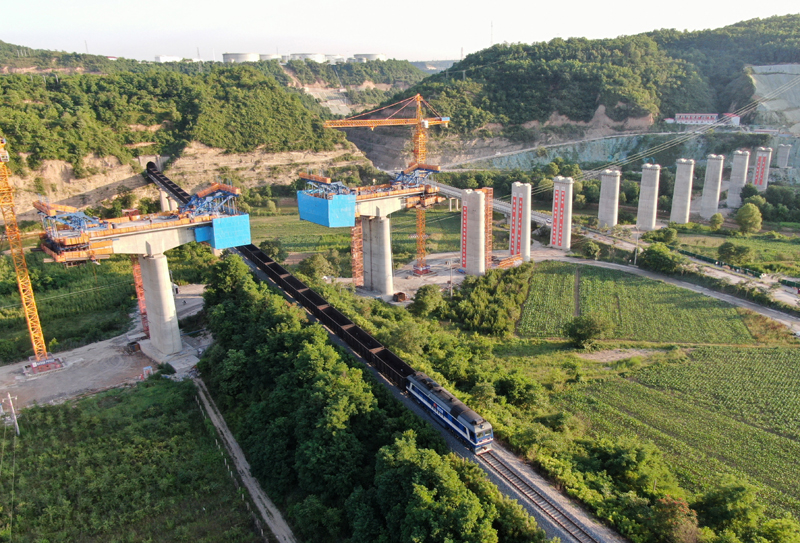 6月25日,在陕西省延安市洛川县,一列火车从施工中的西延高铁北洛河特大桥下驶过(无人机照片)。