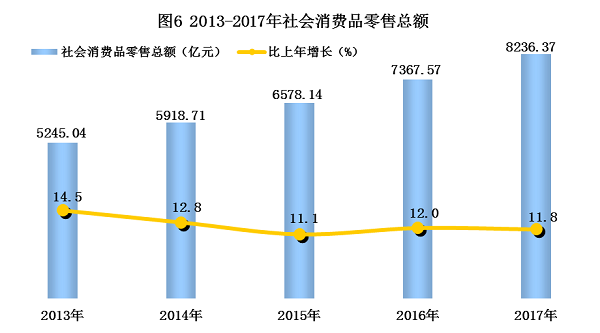 全年社会消费品零售总额8236.37亿元,比上年增长11.8%。按经营地分,城镇消费品零售额7270.55亿元,增长12.0%;乡村消费品零售额965.82亿元,增长10.1%。按消费形态分,商品零售额7396.28亿元,增长11.8%;餐饮收入840.09亿元,增长11.9%。