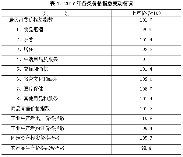 全年居民消费价格总水平上涨1.6%,其中,城市上涨1.8%,农村上涨1.1%;食品下降1.8%,非食品上涨2.5%;消费品上涨0.7%,服务项目上涨3.4%。新涨价因素占93.3%,翘尾因素占6.7%。