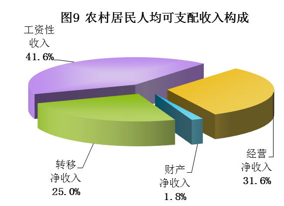 全年农村居民人均可支配收入10265元,比上年增加869元,增长9.2%。其中,工资性收入4272元,增长9.1%;经营净收入3242元,增长6%;财产净收入185元,增长16.4%;转移净收入2566元,增长13.4%。农村居民人均生活消费支出9306元,比上年增加738元,增长8.6%。农村居民年末人均住房建筑面积46平方米,比上年增长2.8%。