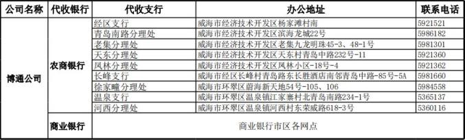 可在威海市商业银行、工商银行、农商银行、光大银行的网点或通过手机app交费。招商银行可通过手机app交费。