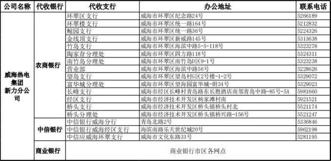 注:中信银行仅限于热电集团新力分公司和文登公司辖区用户。