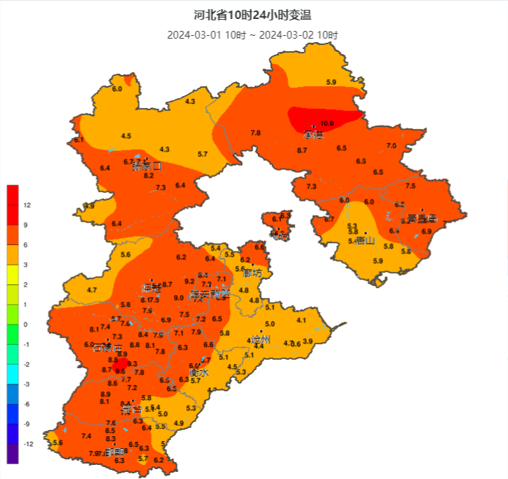 升温后,10时,河北省中南大部气温已升至8℃附近,暖意已初露端倪。