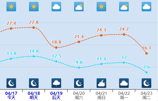 午后,气温继续上扬,省内大部最高气温将攀升至27℃左右。明天暖热升级,中南大部将向30℃线发起冲击。