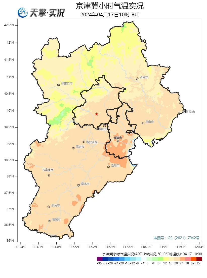 今天10时,在高空脊和地面高压的控制影响下,河北省平原大部地区的温度已升至20℃以上,其中,最高值出现在邯郸的峰峰,达到24.5℃。