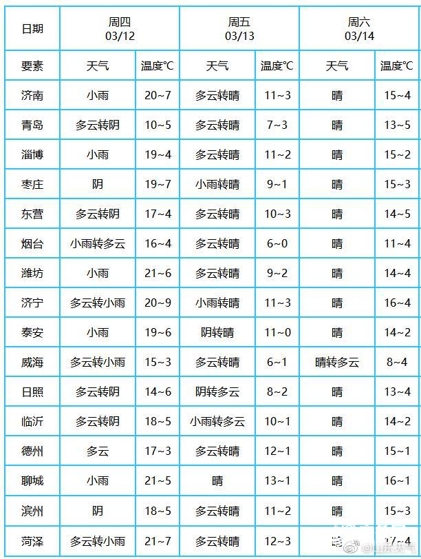 此外,还有断崖式降温,今天多地气温飙升至20℃左右,明天山东多地最高气温只有10℃上下,降温幅度在8~10℃,潍坊降温幅度达12℃。13日夜间到14日早晨最低气温,鲁中山区和鲁东南地区0℃左右,半岛内陆地区-2℃左右,其他地区2℃左右。到周末的时候,气温才重回上升之路。