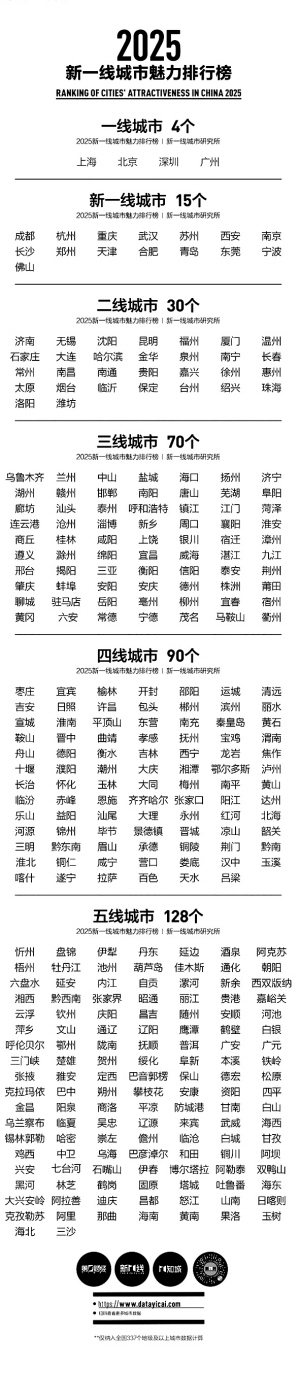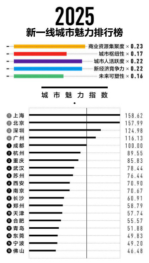 5月28日,第一财经旗下城市数据研究智库新一线城市研究所发布《2025新一线城市魅力排行榜》。一线城市为上海、北京、深圳、广州,15座新一线城市依次为:成都、杭州、重庆、武汉、苏州、西安、南京、长沙、郑州、天津、合肥、青岛、东莞、宁波与佛山。