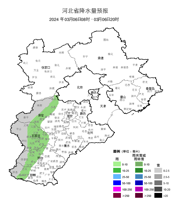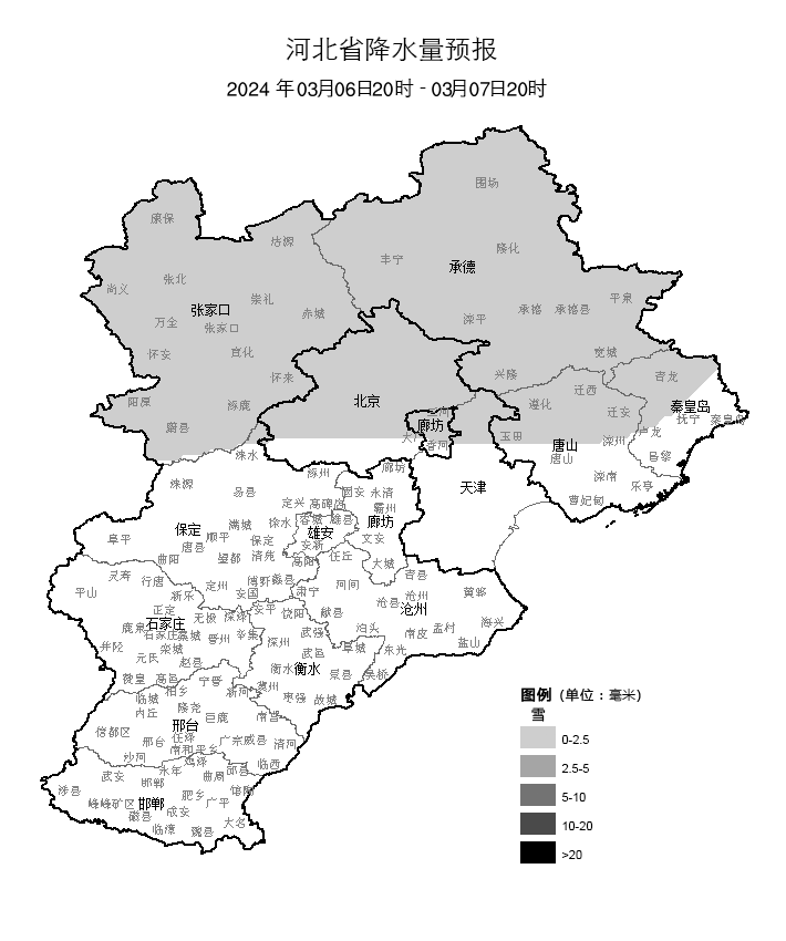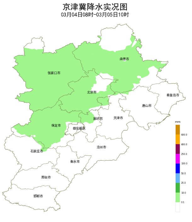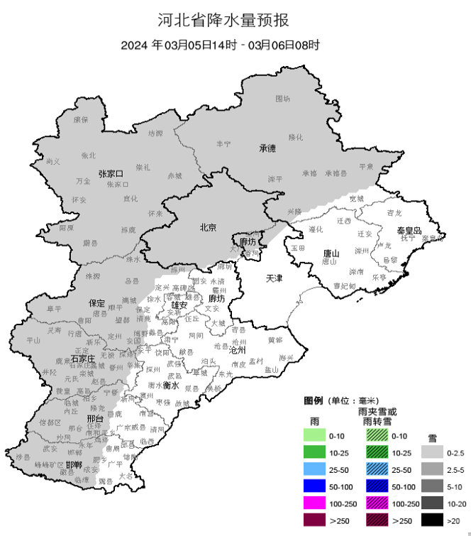 昨天(3月4日)开始,河北新一轮雨雪天气启程。从4日8时至5日10时的降水实况图看,降水主要出现在张家口、承德大部、保定大部、廊坊北部、石家庄北部一带,量级普遍不大,但相态多变(雪、雨夹雪、雨都有出现)。