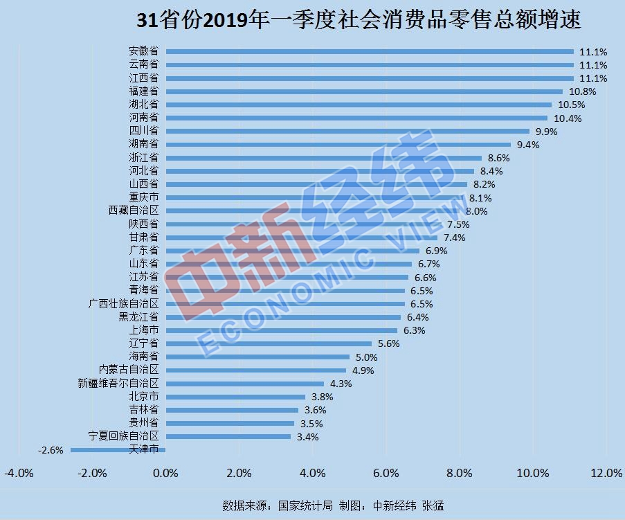 2019年一季度,全国社会消费品零售总额97790亿元,同比名义增长8.3%,梳理31省份社会消费品零售总额增速数据发现,共有安徽、江西、云南、福建、湖北、河南、四川、湖南、浙江、河北10个省份跑赢全国。