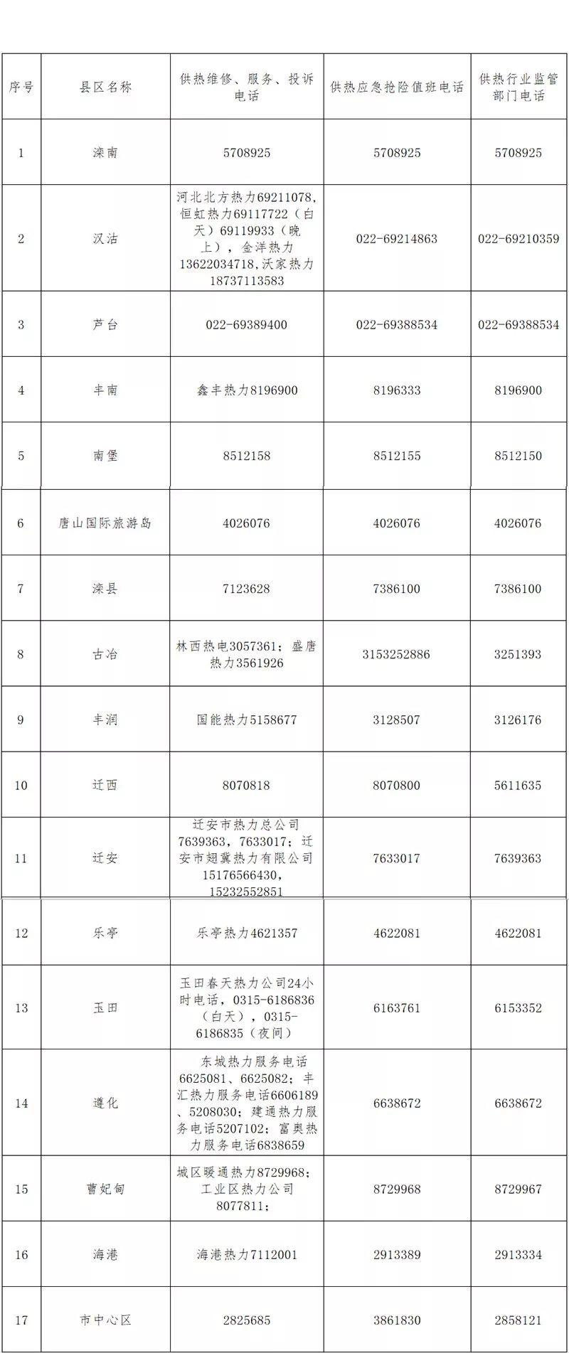 唐山市各县(市)、区供热投诉和应急值班电话表(2018年11月5日)