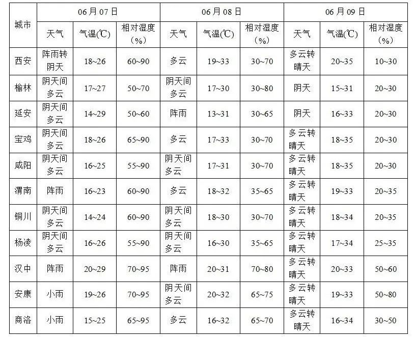 9日:陕北阴天转多云,陕北北部部分地方有小雨或阵雨(0-3mm),关中、陕南多云转晴天。关中东部部分地方日最高气温可达35℃以上。