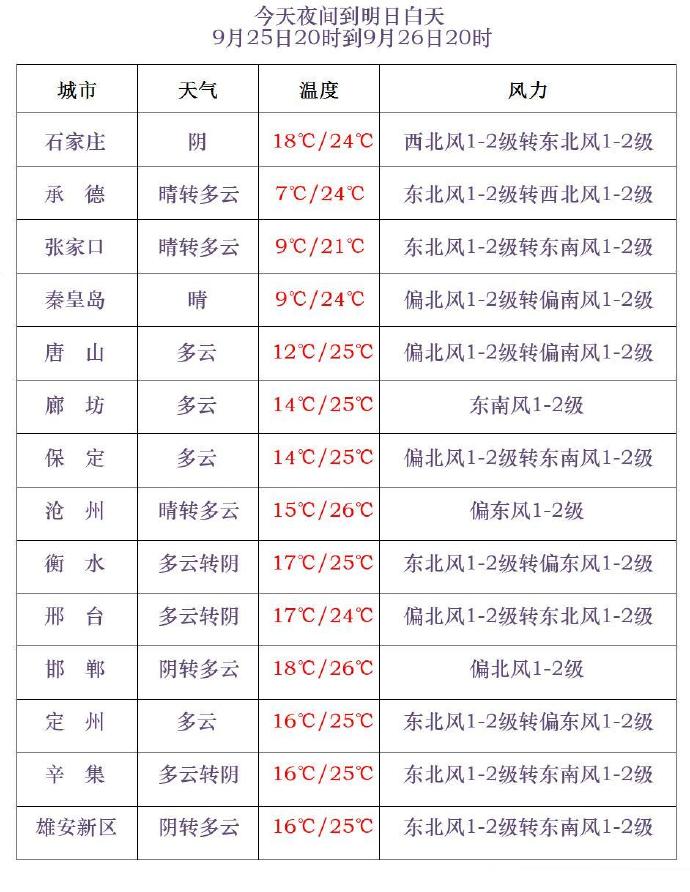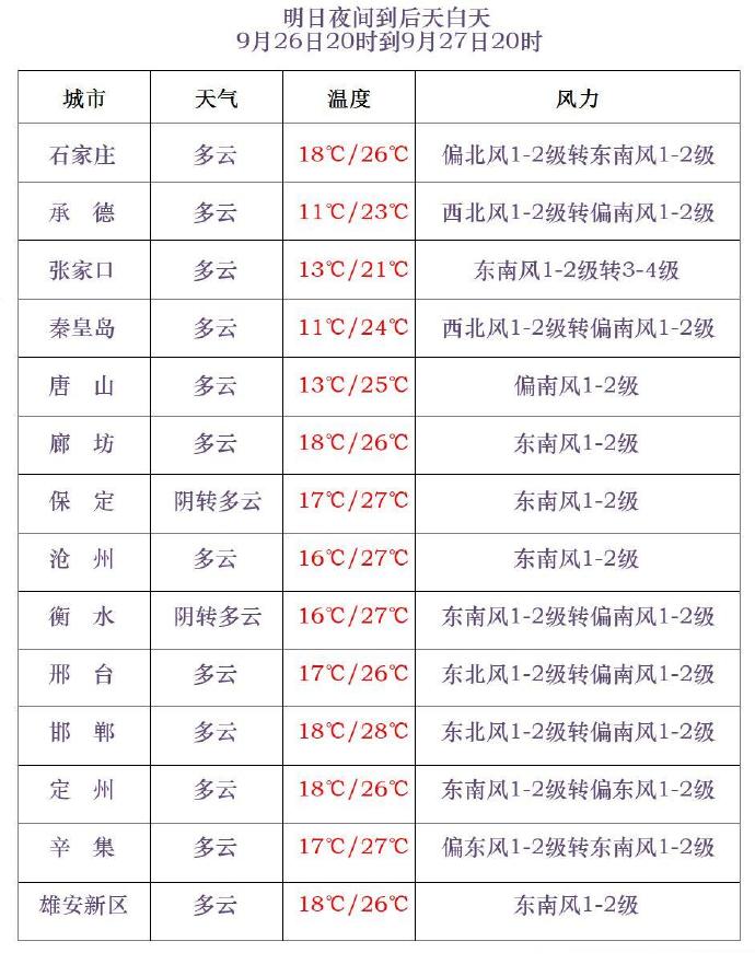明天夜间到27日,张家口南部和承德、保定、石家庄、邢台、邯郸五个地区的西部多云转阴有分散性阵雨,其他地区多云。