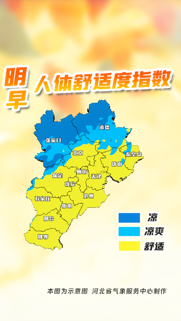 预计明天(26日)早晨,河北省北部大部分地区和太行山区的个别地点体感凉爽或凉,此外省内其他地区体感舒适。大家还需根据所属区域合理着装,及时调整。