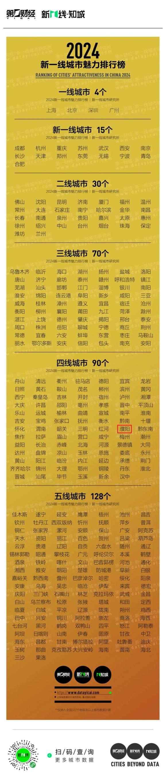 在包含中国内地337个地级及以上城市的“2024年城市分级完整名单”中,濮阳位列四线城市。