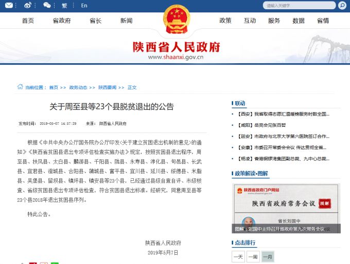西安市周至县退出贫困县序列,这标志着西安市目前唯一的贫困县脱贫摘帽。公告中指出:按照贫困县退出程序,周至县等23个县已经通过县级自查自评、市级核查、省级贫困县退出专项评估检查,符合贫困县退出标准。