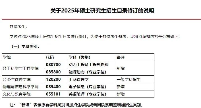 25考研新增080700动力工程及工程热物理、085800能源动力(专业学位)、085400电子信息(专业学位)、055101英语笔译(专业学位)。
