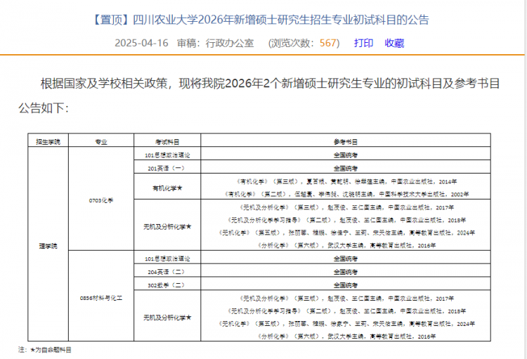 四川农业大学理学院2026年新增化学、材料与化工两个硕士研究生招生专业。