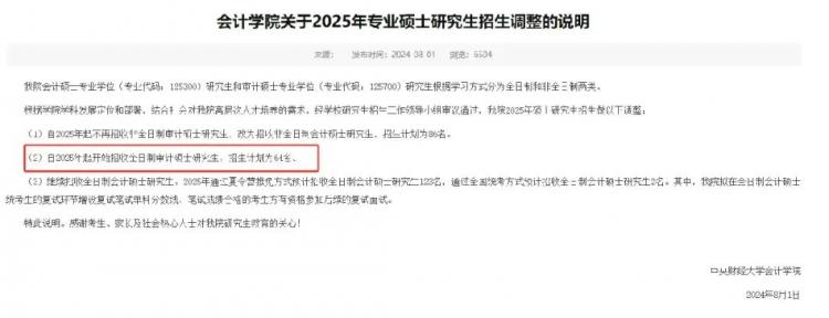 自25年开始招收全日制审计硕士研究生,招生计划为64名。