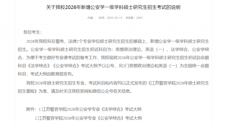 2026年拟在警务、法律2个专业学位硕士研究生招生的基础上,新增公安学一级学科硕士研究生招生。
