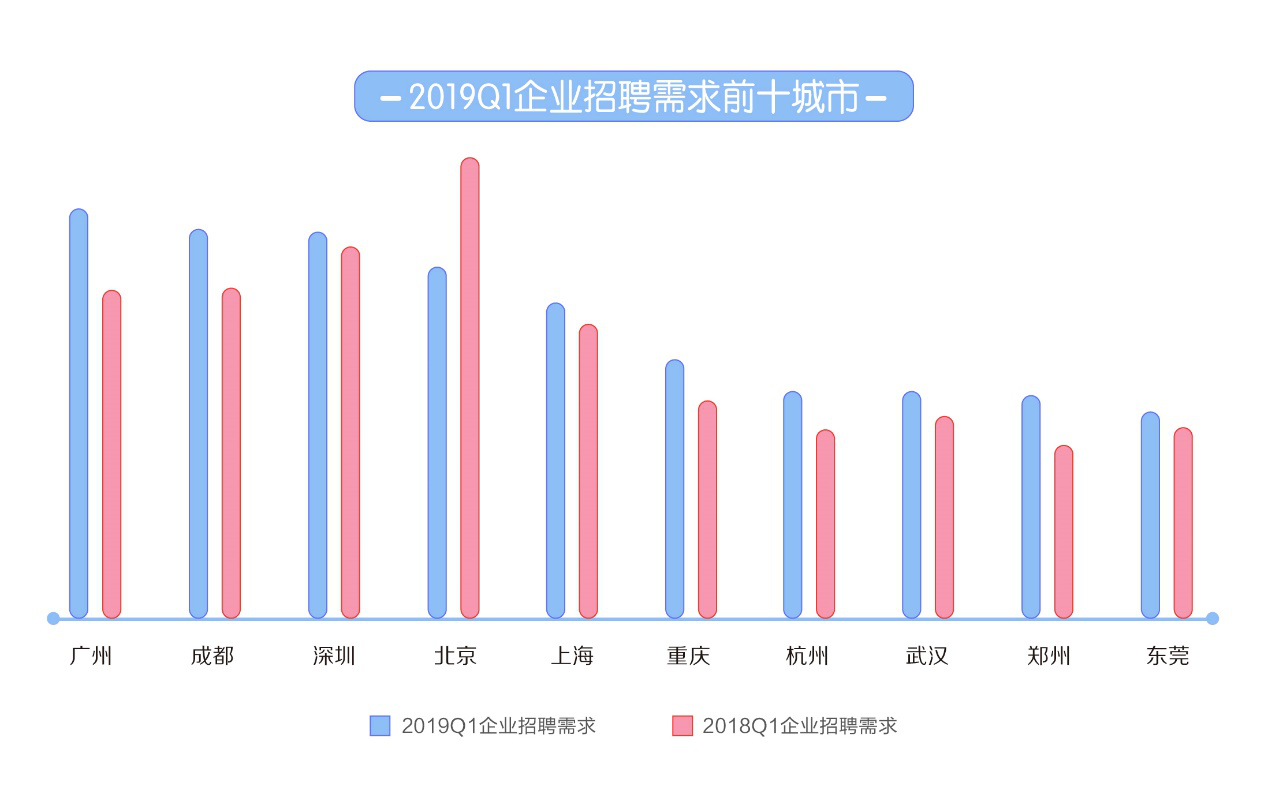 报告显示,今年一季度,企业招聘需求前十城市依次为广州、成都、深圳、北京、上海、重庆、杭州、武汉、郑州、东莞,与去年同期相比,招聘需求前十城市未变,一线城市仍是招聘需求最大的市场。其中,企业招聘需求最大的城市为广州,同比2018年一季度增长24.95%。