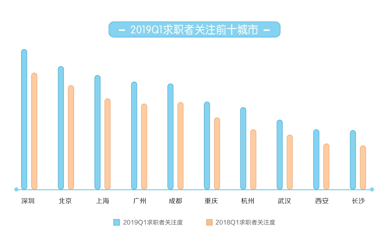 2019年一季度,各城市求职活跃度均有所上升,北上广深依然是求职首选,其中,深圳成为求职者最关注的城市,北京排名第二。新一线城市的求职热度增幅显著,报告显示,杭州求职者人数同比增幅达到35.1%,求职热度增幅排名第一。长沙求职数同比增长34.25%,跻身最热门求职城市前十,增幅排名第二。
