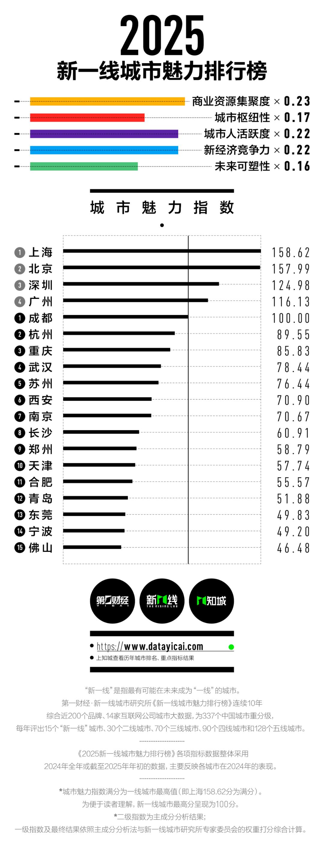 《新一线城市魅力排行榜》的指标体系包含了商业资源集聚度、城市枢纽性、城市人活跃度、新经济竞争力和未来可塑性五大一级维度。榜单的一级与二级维度权重以新一线城市研究所专家委员会打分的方式计入,二级维度以下指标数据则采用主成分分析法。榜单各细分维度指标主要采用2024年全年或者截至2025年年初的数据计算得出。