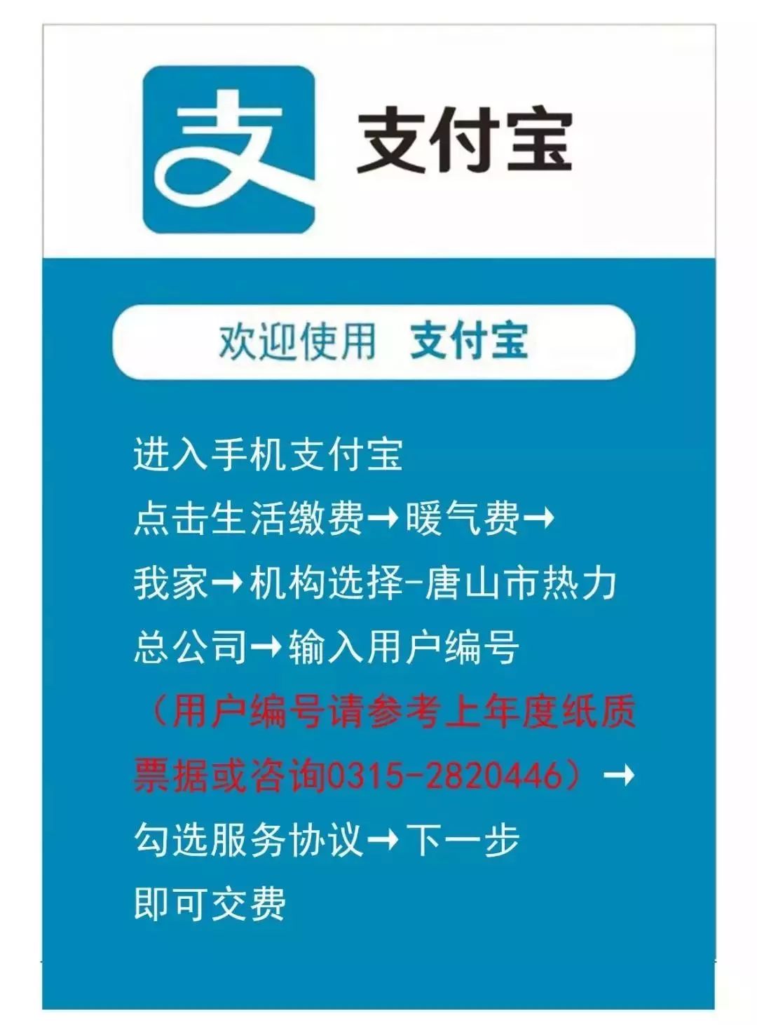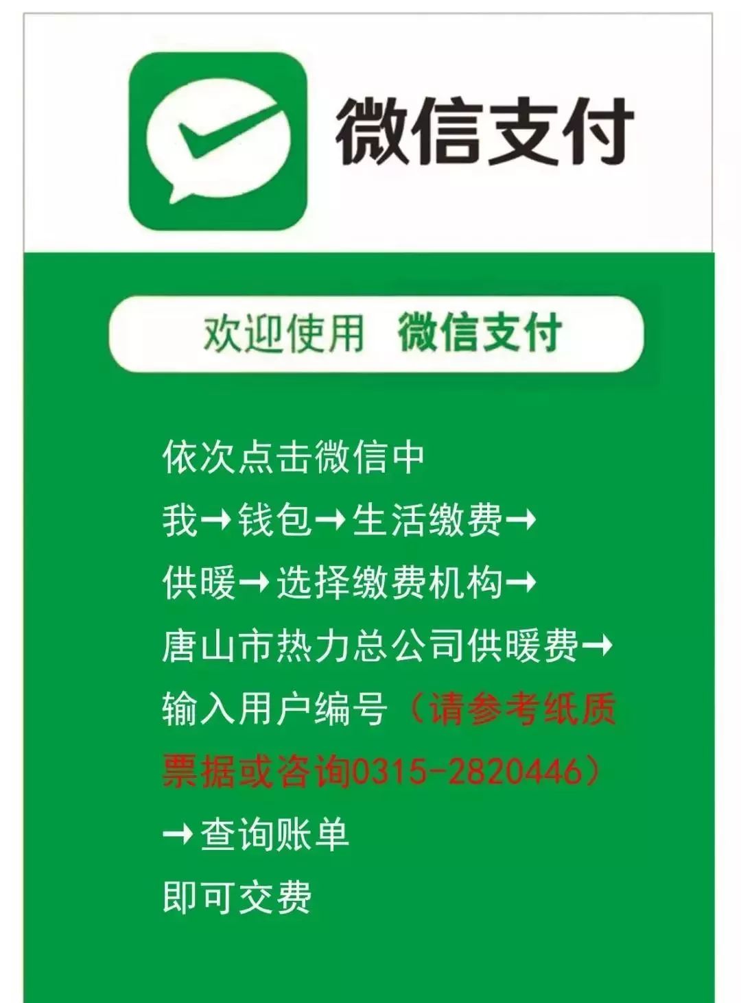 温馨提示2、通过银行电子渠道、热力微信公众号、微信钱包、支付宝支付的交费时间:对于往年无陈欠热费的直管居民热用户均支持全天24小时交费服务;通过银行电子渠道、热力微信公众号、微信钱包、支付宝支付交费需要的“用户编号”,可在上年度纸质票据票面上查找,也可通过拨打0315-2820446进行人工咨询。